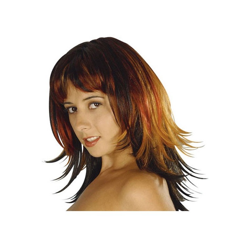 Perruque noire et mèches rousses avec cheveux longs synthétique Fabriqué avec soin avec des cheveux synthétiques de qualité. Nettoyer avec du shampoing et de l'eau tiède.